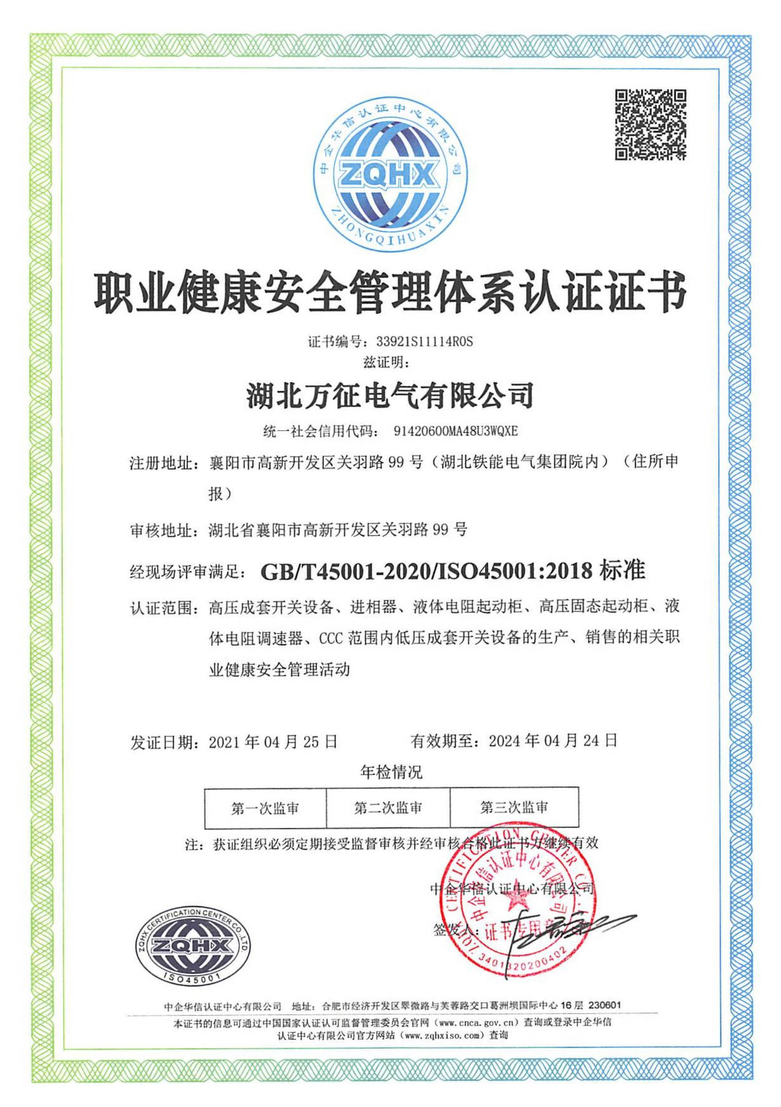 日前,中企華信認證中心向湖北萬征電氣有限公司頒發了質量管理體系認證證書、環境管理體系認證證書以及職業健康安全管理體系認證證書,這是湖北萬征電氣有限公司分別按GB/T19001-2016-ISO9001:2015、GB/T24001-2016-ISO14001:2015及GB/T45001-2020-ISO45001:2018標準要求進行的換證認證。本次質量管理體系覆蓋的范圍包括:高壓成套開關設備、進相器、液體電阻起動柜、高壓固態軟起動柜、液體電阻調速器、CCC范圍內低壓成套開關設備的生產與銷售。